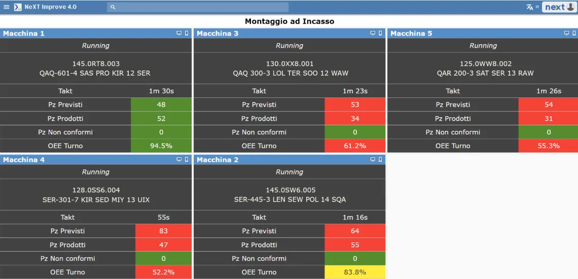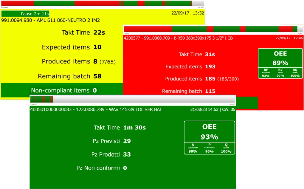 The different background colors provide an immediate perception of the production progress, as they are associated with different OEE percentage ranges..